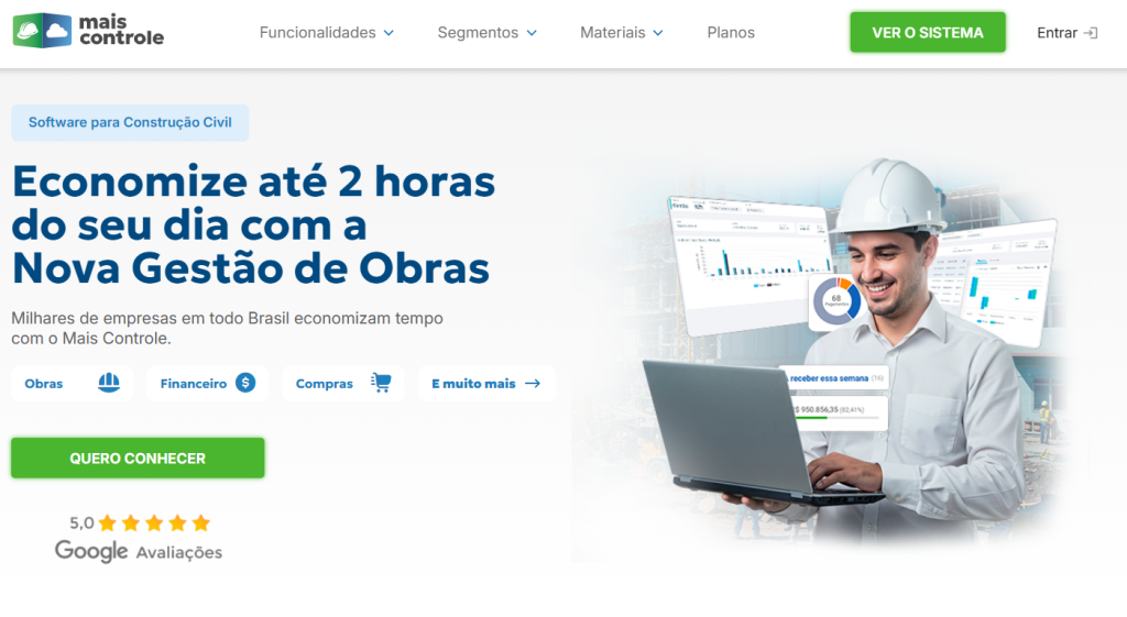 Focado na gestão financeira e de obras para pequenas e médias empresas, o Mais Controle é uma forte resposta para a busca de software para pequenas construtoras. Ele simplifica a integração entre o orçamento da obra e as contas a pagar, oferecendo uma visão clara se a obra está dando lucro ou prejuízo em tempo real.