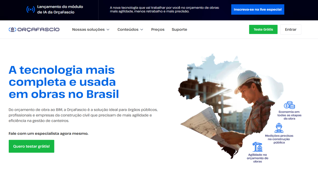 O orçamento é o coração financeiro da obra, e o Orçafascio se especializou nessa dor. Posiciona-se fortemente como um software para orçamento construção civil, destacando-se pela integração nativa com a base SINAPI e outras tabelas de preços regionais. Isso agiliza tremendamente a elaboração de propostas para obras públicas e licitações.