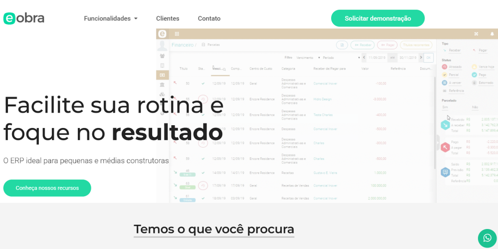 O Eobra oferece plataforma de gestão integrada que equilibra funcionalidades robustas com interface moderna. Atende desde pequenas construtoras até incorporadoras de médio porte. Destaca-se pelo controle de estoque simples e assertivo, com múltiplas formas de gestão de materiais. O módulo financeiro oferece tabelas de preço integradas, facilitando criação de orçamentos. Investe em segurança e privacidade dos dados, com infraestrutura em nuvem protegida e backups automáticos.